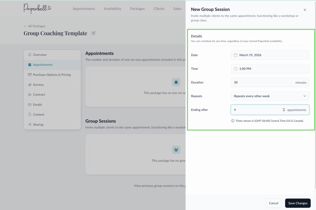 You can set up recurring group sessions as well. Choose from weekly, monthly, or every other week, and clients will be invited to the whole series.