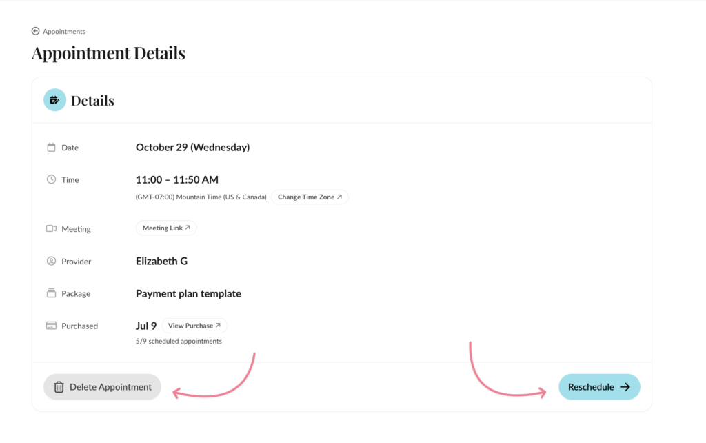 On the next screen, you’ll see buttons to Reschedule and Delete Appointment.