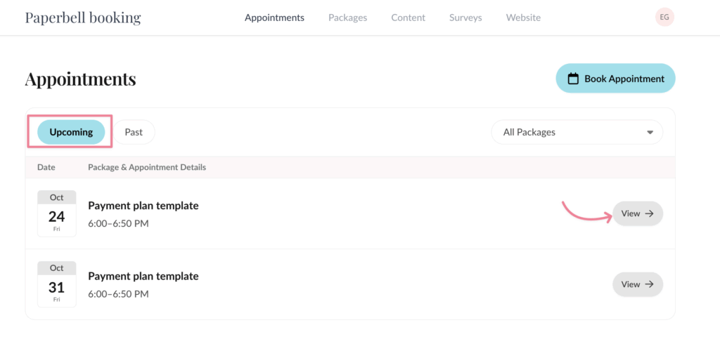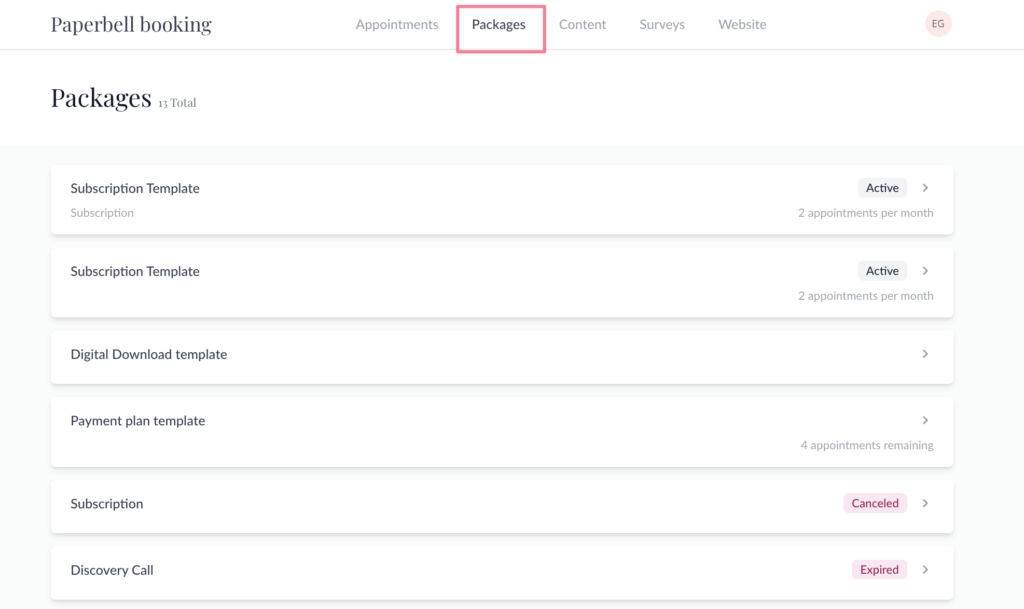 This page contains a list of all your packages, the number of appointments you have left to book in your packages, and if a subscription or payment plan package is active, canceled, or expired.
