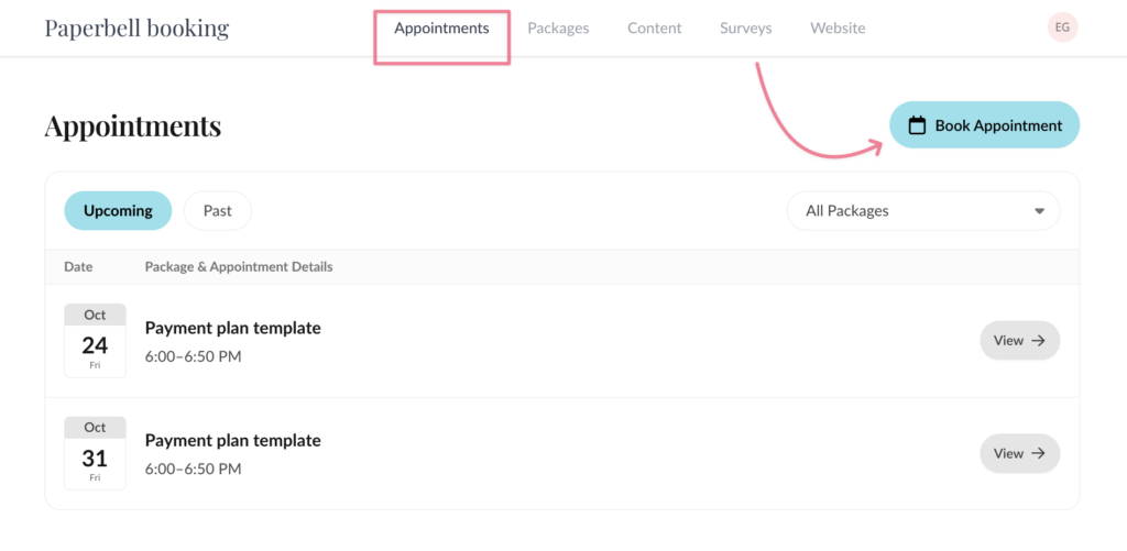 Go to Appointments and click the Book Appointment button in the top-right corner, which will only appear if you have unused sessions to book.
