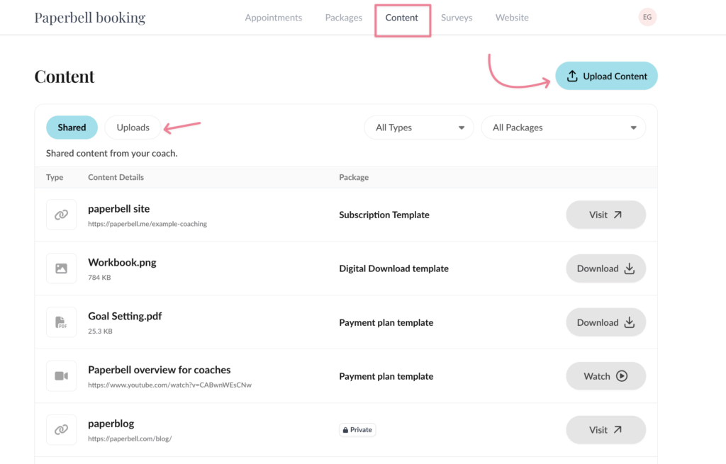 You can see what you’ve shared with your coach from the Uploads tab.