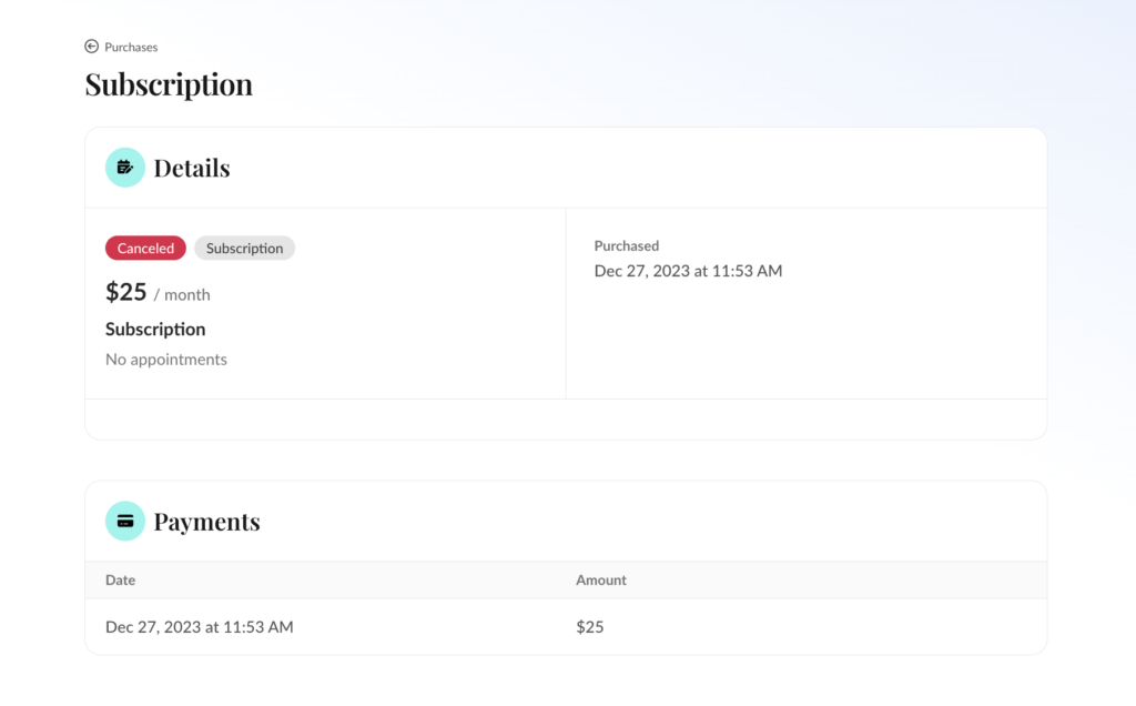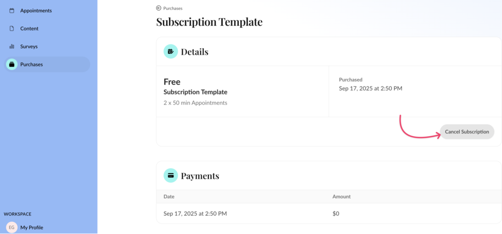 This page lists all your packages, the date and price of your purchase, and the number of appointments you have left to book. If you have a subscription or payment plan package, you’ll see if it’s active, cancelled, or expired.