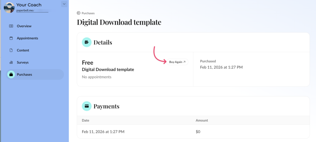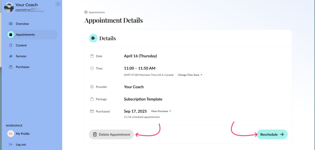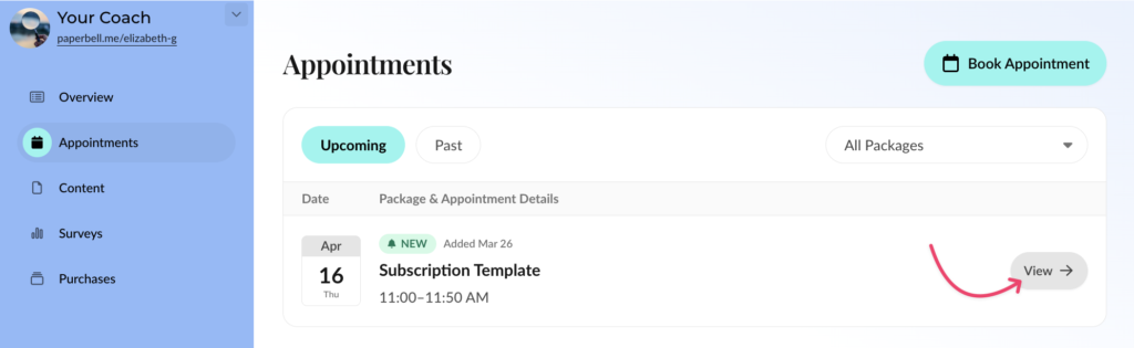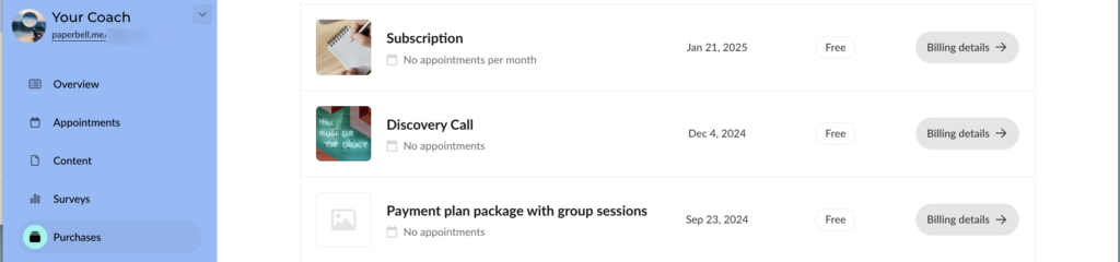 Your coach shares a link to their Paperbell site, where you can book or purchase one of their offerings.
