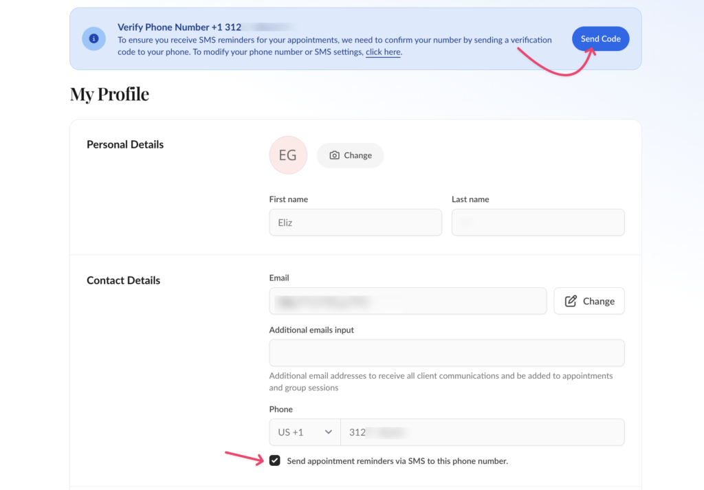 Add your phone number in My Profile to receive SMS reminders before appointments. (If you don’t see this option, it’s because your coach hasn’t turned this on!)